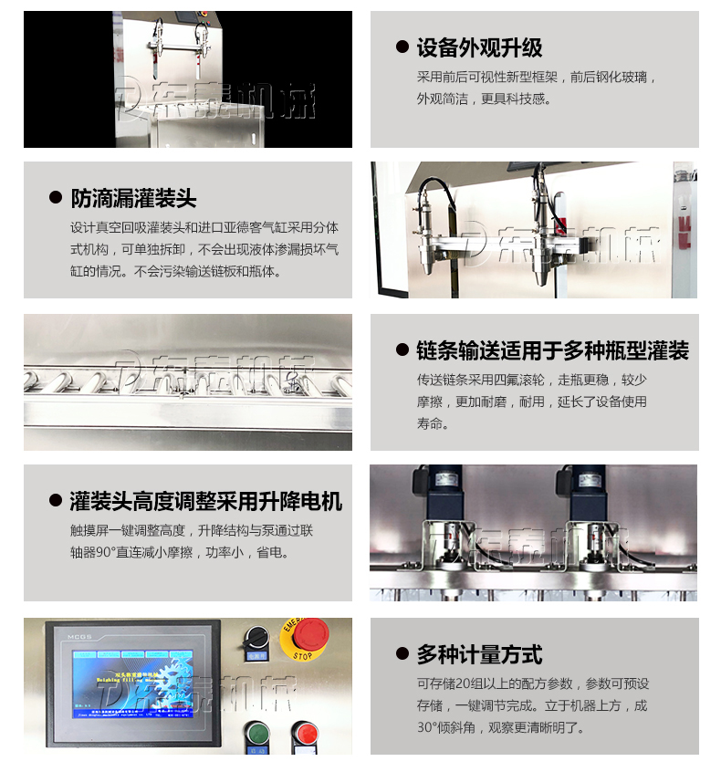 2:半自動油脂灌裝機采用手動上瓶單速控制灌裝流速,勻速灌裝,使用氣動內(nèi)封閉式灌裝閥嘴可有效防止灌裝過程的滴漏;