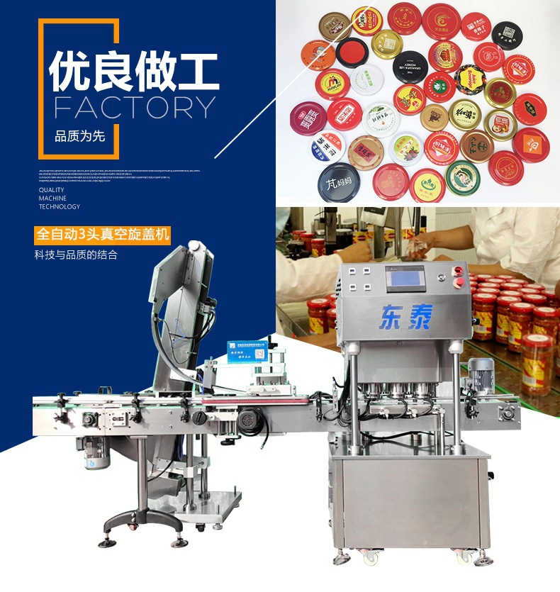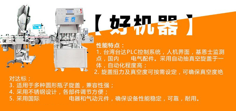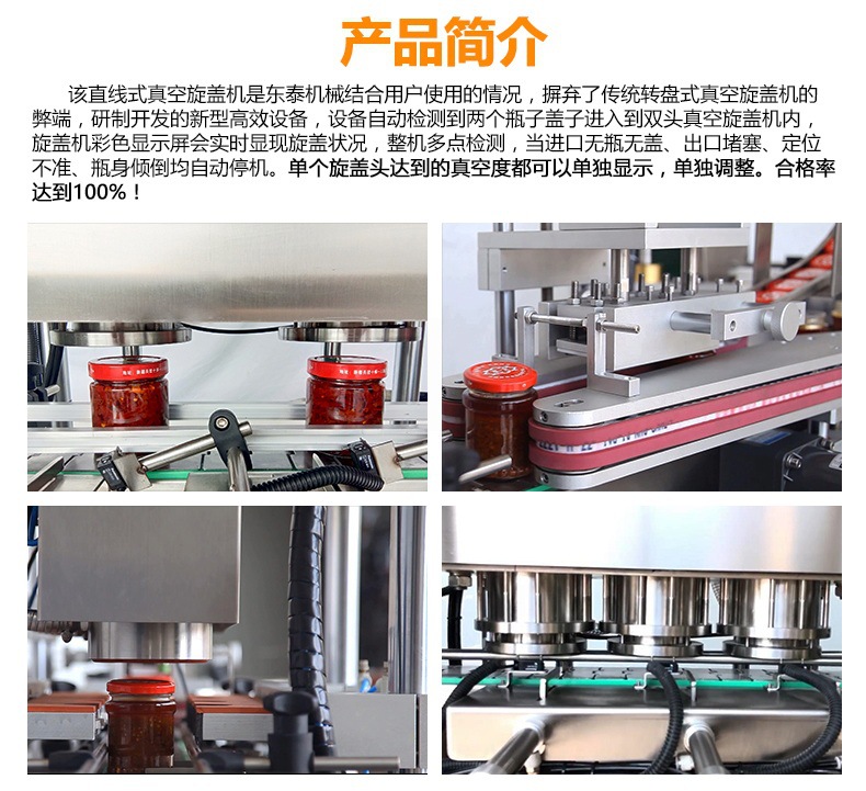 該直線式真空旋蓋機是東泰機械結合用戶使用情況,摒棄了傳統轉盤式真空旋蓋機的弊端,研制開發的新型高效設備,設備自動檢測到兩個瓶子蓋子進入到雙頭真空旋蓋機內,旋蓋機彩色顯示屏會實時顯示旋蓋狀況,整機多點檢測,當進口無瓶無蓋、出口堵塞、定位不準、瓶身傾倒均自動停機。單個旋蓋頭達到的真空度都可以單獨顯示,單獨調整。合格