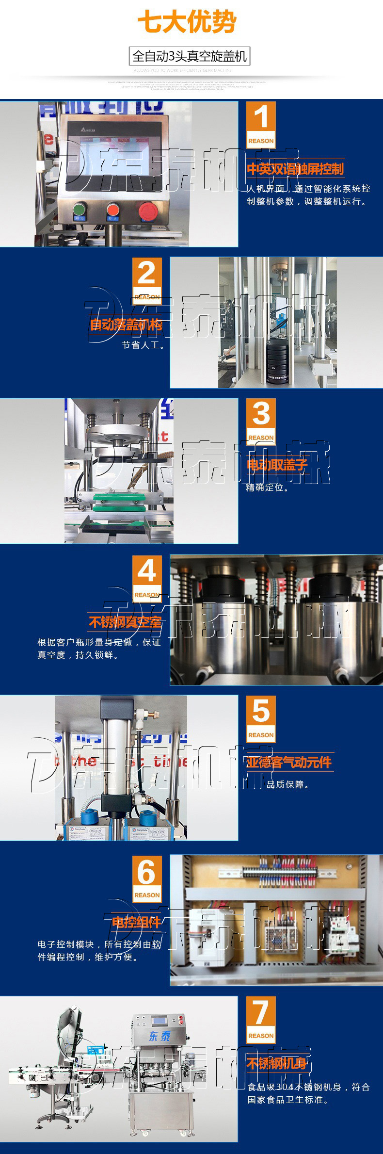 1.臺灣臺達PLC控制系統,人機界面,基恩士檢測點,國內電氣配件。采用自動抽真空旋蓋于一體,自動化程度高;