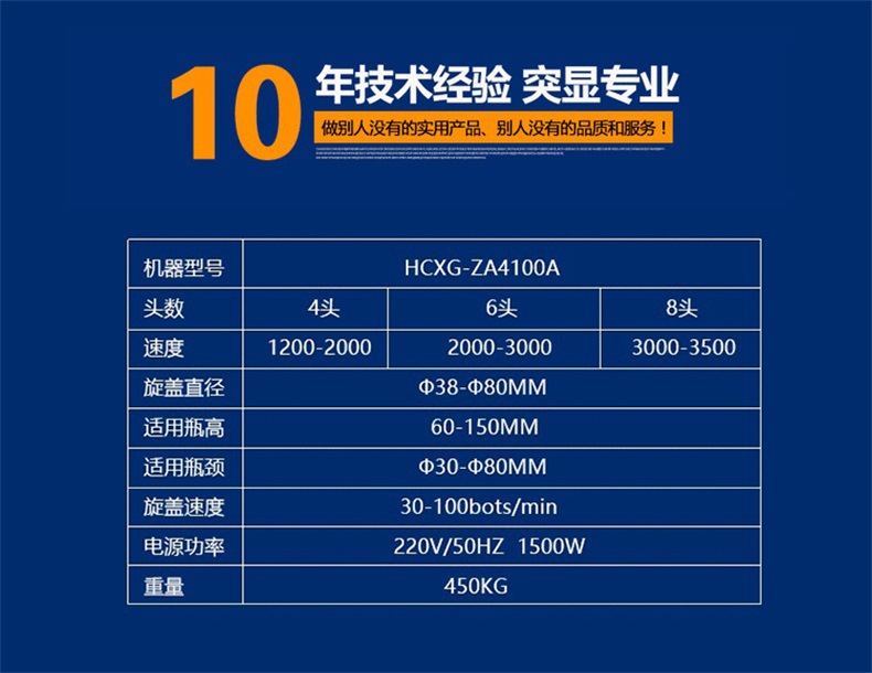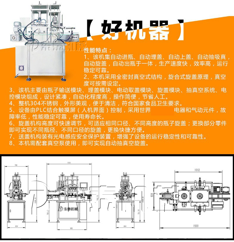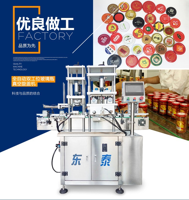 該機借鑒國外技術,結合國內客戶需求研發而成。該機集自動進瓶、自動理蓋上蓋、自動抽真空旋蓋、自動出瓶于一體,生產效率高,運行穩定可靠,是食品醬料、飲料、保健品等行業馬口鐵三(四)旋蓋理想的抽真空旋蓋設備。