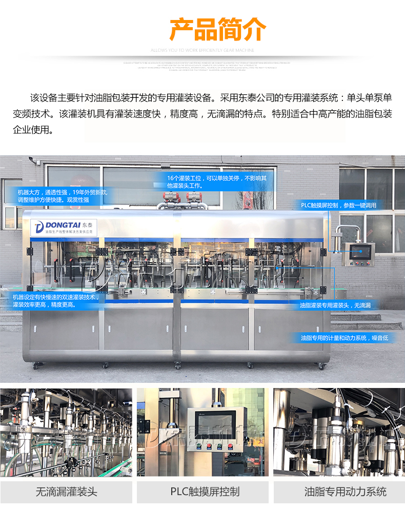 該大型潤滑油灌裝機采用容積式計量灌裝原理,適用于各種規格(1-5L)的液體肥等液體灌裝。設備采用伺服驅動活塞計量,保證了 1‰的灌裝,在保證灌裝的同時,提高了 20%-35%的灌裝速度,操作簡單,維護方便,節省人工成本,生產效率更高。