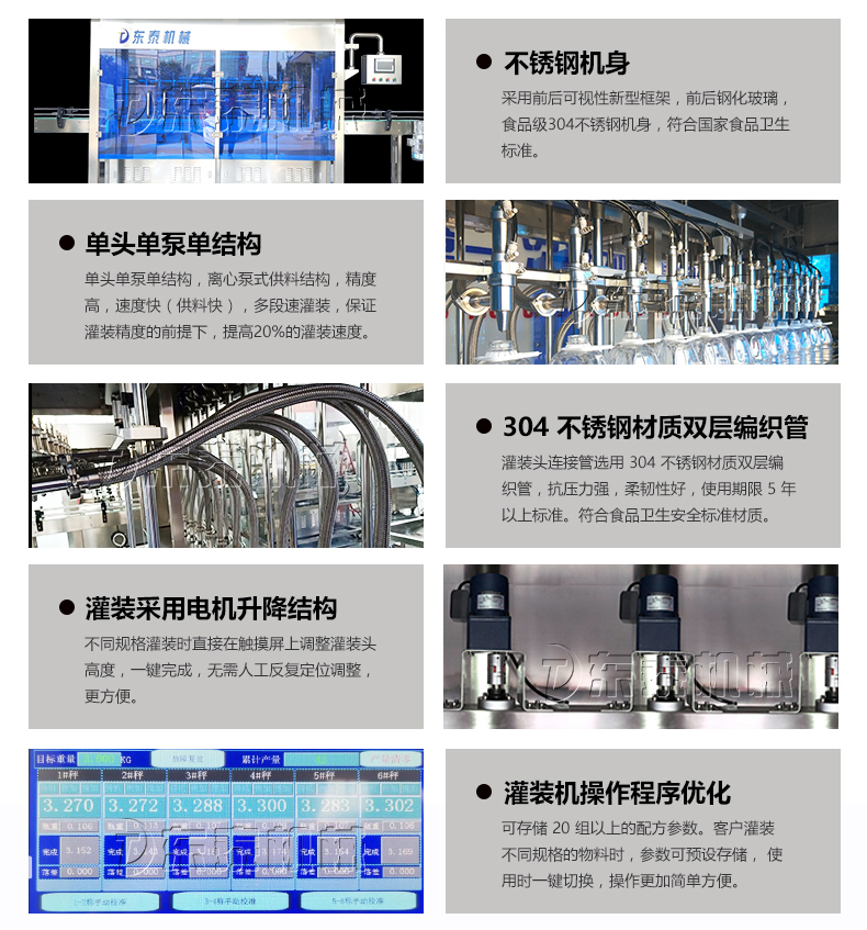 驅(qū)動方式更是通過伺服電機配合滾珠絲杠帶動相應料缸內(nèi)的活塞做往復運動,從而讓料缸前腔產(chǎn)生負壓,以電機脈沖控制電機旋轉(zhuǎn)并控制活塞行程,從而調(diào)節(jié)灌裝量。驅(qū)動的方式應用于容積柱塞式灌裝方式,這種灌裝方式和物料接觸部分均為不銹鋼316L 材質(zhì),灌裝過程中無污染,各物料轉(zhuǎn)換清洗方便,車間灌裝結(jié)束設(shè)備維護清洗便捷,大大優(yōu)于自流其他灌裝方式。氣缸驅(qū)動相比伺服驅(qū)動針對灌裝的計量范圍更加廣泛靈活,針對客戶多種灌裝規(guī)格的需求服驅(qū)動方式調(diào)整方便,僅需在觸摸屏上設(shè)置即可,一般出廠可以根據(jù)客戶常用規(guī)格直接寫入程序。伺服驅(qū)動方式灌裝速度快,不受氣壓的影響,灌裝速度可控??傊核欧?qū)動方式在操作使用、精度誤差、整機調(diào)整、設(shè)備清洗、維護保養(yǎng)等方面更加方便客戶使用。并且我們公司有著優(yōu)質(zhì)的售后服務團隊為您以后的使用保駕護航。