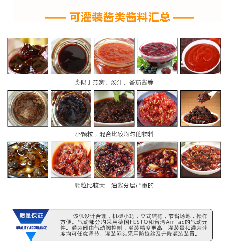 身為公司新生產制造的灌裝機在行業市場上發揮了重要的作用,是集光,機,電,氣于一體,選用活塞式定量原理,灌裝精確度高,使用比較簡單,維護非常方便,設備主要材質:辣椒醬灌裝機選用SUS304不銹鋼制造,衛生指標要求.灌裝環節選用亞克力透明板與外部隔離,確保灌裝的衛生要求。灌裝選用壓力式灌裝,無須配裝高位罐,簡易化了組裝工序,提高了灌裝工作效率。可普遍使用于食品、醬料制造業設備的自動化包裝生產制造