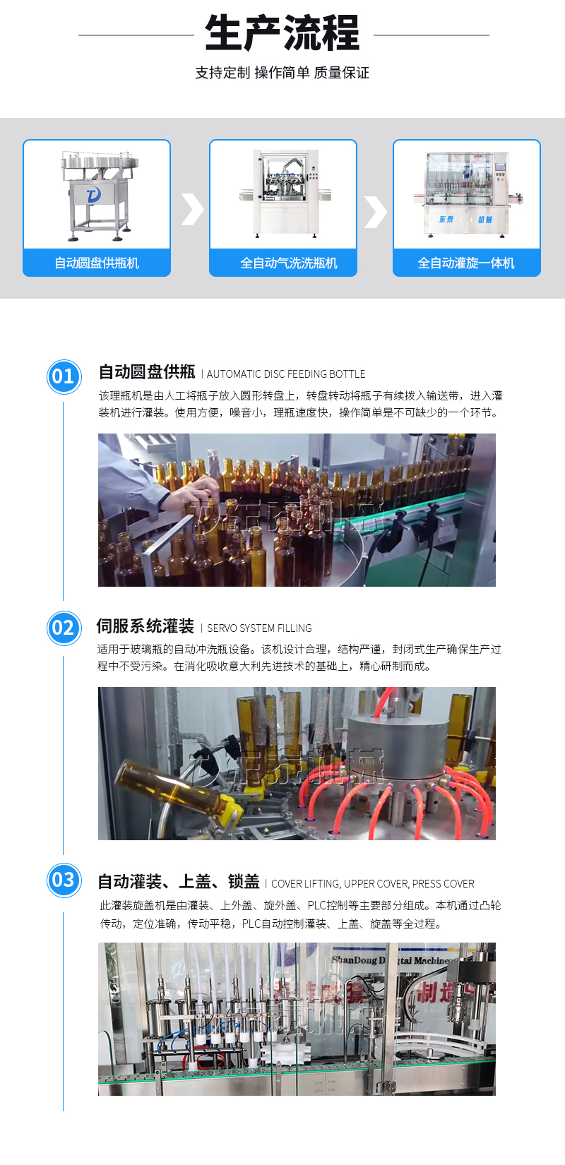此橄欖油灌裝旋蓋機生產(chǎn)線是由灌裝、上外蓋、旋外蓋、PLC控制等主要部分組成。本機通過凸輪傳動,定位準確,傳動平穩(wěn),PLC自動控制灌裝、上蓋、旋蓋等全過程。并可配置全自動注塑機,由吹瓶直接進入灌裝系統(tǒng),防止交叉感染,整個過程全部在無菌條件下完成,無需洗瓶和烘干。此灌裝旋蓋機適合于食用油、藥品等粘流體的灌裝生產(chǎn)。